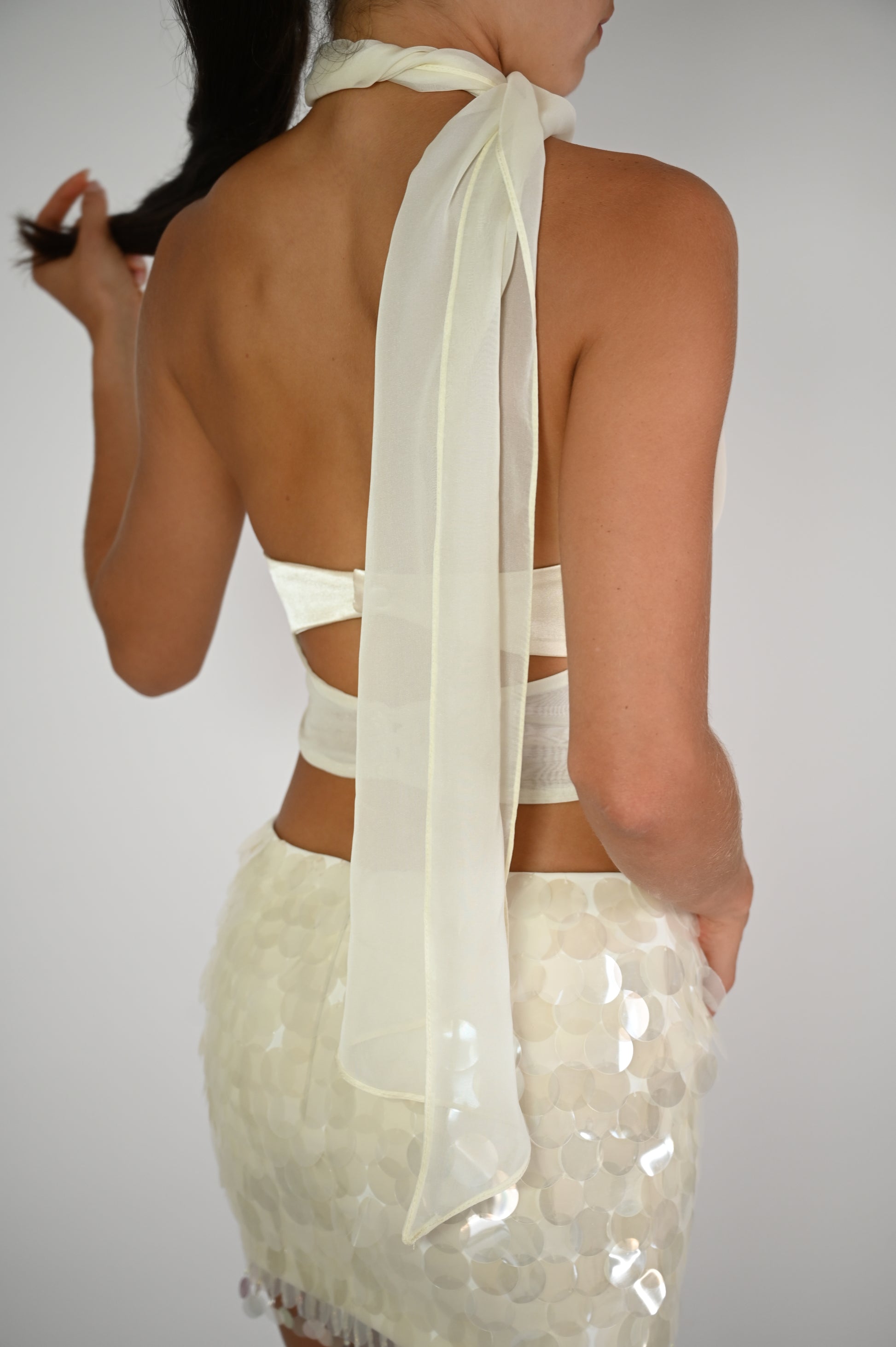 This cream mini skirt is adorned with oversized iridescent sequins that catch the light from every angle. Finished with a delicate beaded fringe hem, it adds playful movement and a touch of glamour to any look.