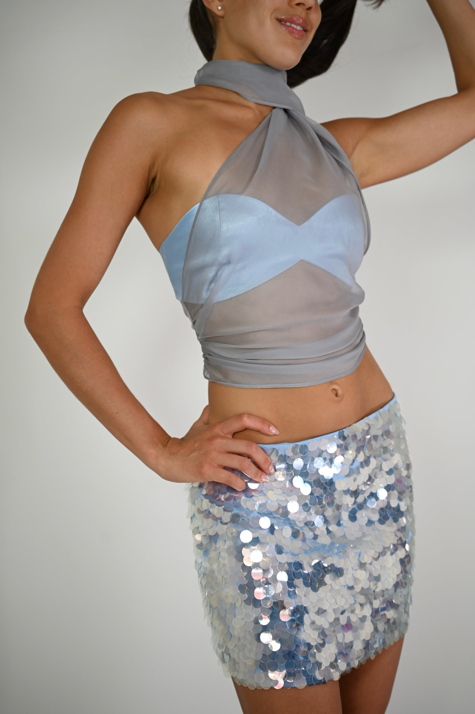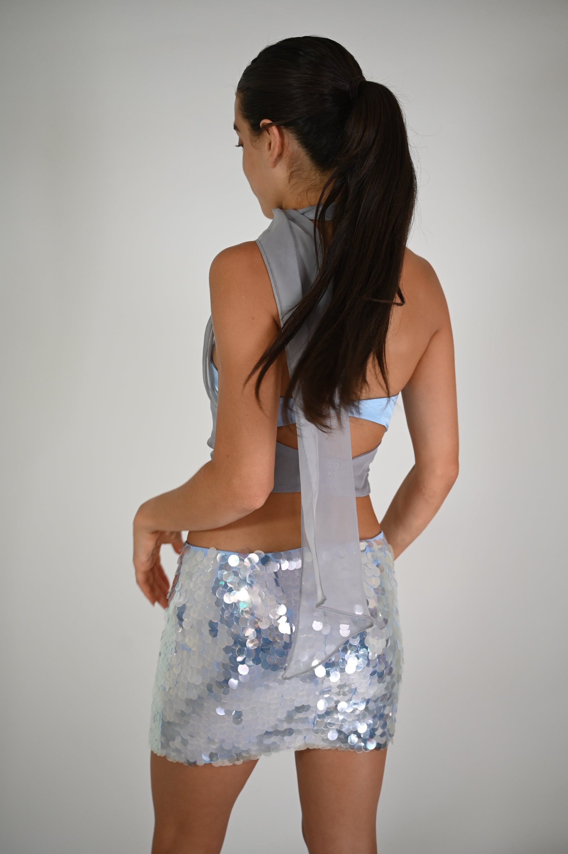 This light blue mini skirt is embellished with iridescent sequins that catch and reflect the light for a shimmering effect. With its fitted silhouette and subtle sparkle, it’s an eye-catching choice for evening wear or special occasions.